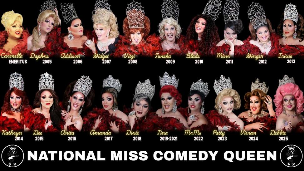 National Miss Comedy Queen is open to any femme presenting queen who has qualified through one of our preliminary contests or has been approved by the board using a self appointed "Wild Card" or "Top 5" option. They are judged on comedic value and creativity. Judged categories are Interview, Presentation (themed), Comedic Talent, Outrageous Evening Gown and 60 Second Spokesperson .